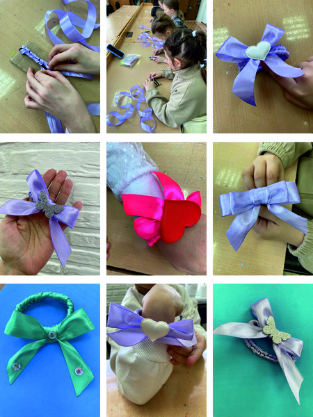 * познакомились с базовыми техниками работы с атласными лентами: сборкой, фиксацией и декорированием;