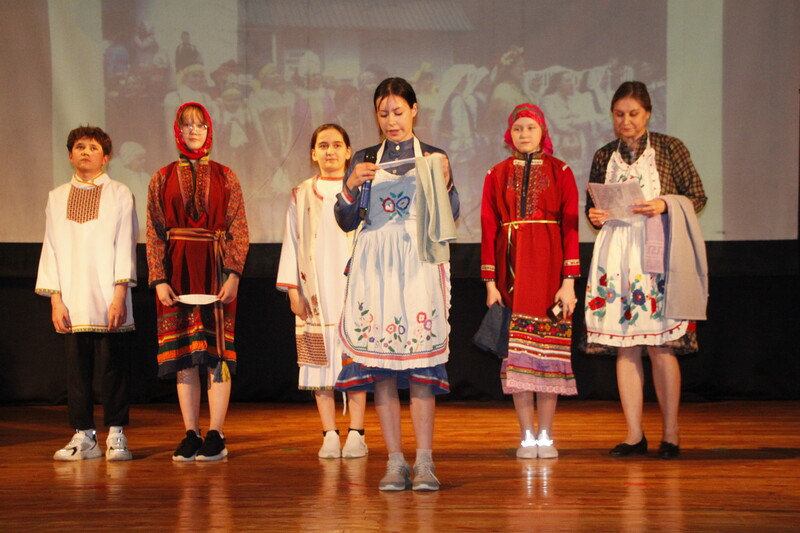 Открыл русский блок показ нашего национального костюма — сарафан, русский платок, косоворотка, которые представили участники