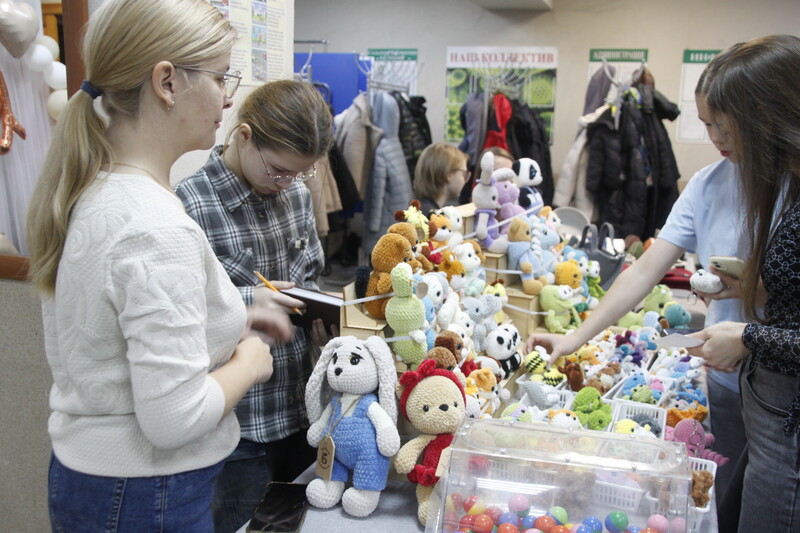 Фойе преобразилось в уютную мастерскую творчества, где сияли изделия народных умельцев: мягкие игрушки, вязаные сумки и лукошки, подушки и украшения — всё это было создано заботливыми руками местных мастериц.