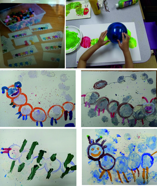 Выполнение рисунка: С помощью кисти и деревянной палочки делаем набрызг на подготовленный картон, использовать можно как один цвет, так и несколько. Пока фон подсыхает, наливаем на плоскую тарелочку жидкую гуашь двух или трех цветов. Опускаем туда шарик и последовательно отпечатываем круги на картоне. На первом круге прорисовываем усики, глазки, ротик гусенице. На всех оставшихся кругах - лапки. Можно пофантазировать и сделать гусеницу пушистой или добавить узоры на спинку. Когда работа полностью высохнет, приклеиваем на клей декоративные элементы.